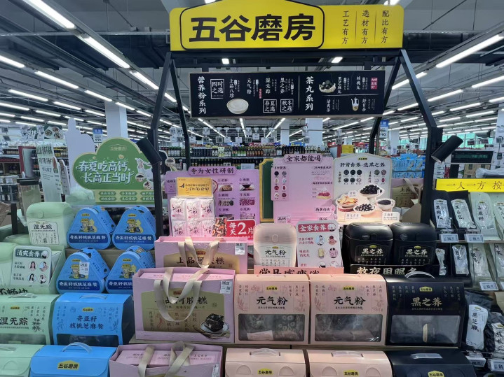 另外,五谷磨房品牌占据了一整个单独的堆头,以“按需定制”为卖点出售各类有养生概念的产品,单价显然更高,礼盒产品在128元至398元不等。该超市的促销人员对界面新闻称,五谷磨房这样的单独堆头已经持续了多年,有很多送礼需求的客户购买。