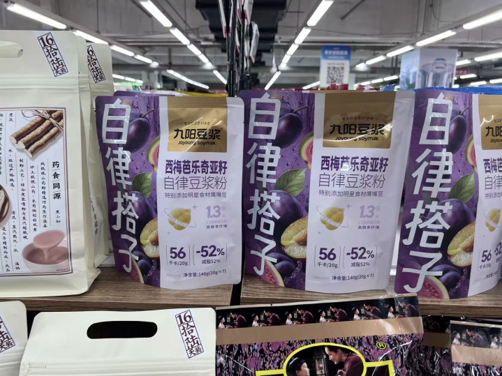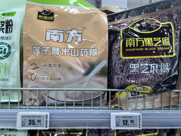 4月27日,界面新闻走访北京一家大型商超发现,在冲泡类产品的货架上,南方黑芝麻仅有黑芝麻糊、莲子薏米山药糊两款产品。而旁边有更多豆三叔、周氏、黑小知、九阳豆浆等新品牌,以及包括“西梅芭乐奇亚籽豆浆粉”、“羽衣甘蓝奇亚籽豆浆粉”、“人参黄芪元气粉”等更有时髦概念的产品。