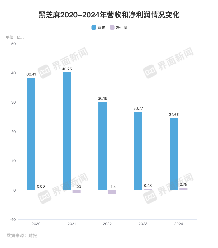 界面新闻注意到,自2022年之后,南方黑芝麻的年营收就在不断缩水,跌破了30亿元大关;2021年和2022年也遭遇了亿元级亏损。截至发稿前,该公司尚未披露2025年年报,业绩预告称其2025年归母净利润为-5200万元至-3500万元。